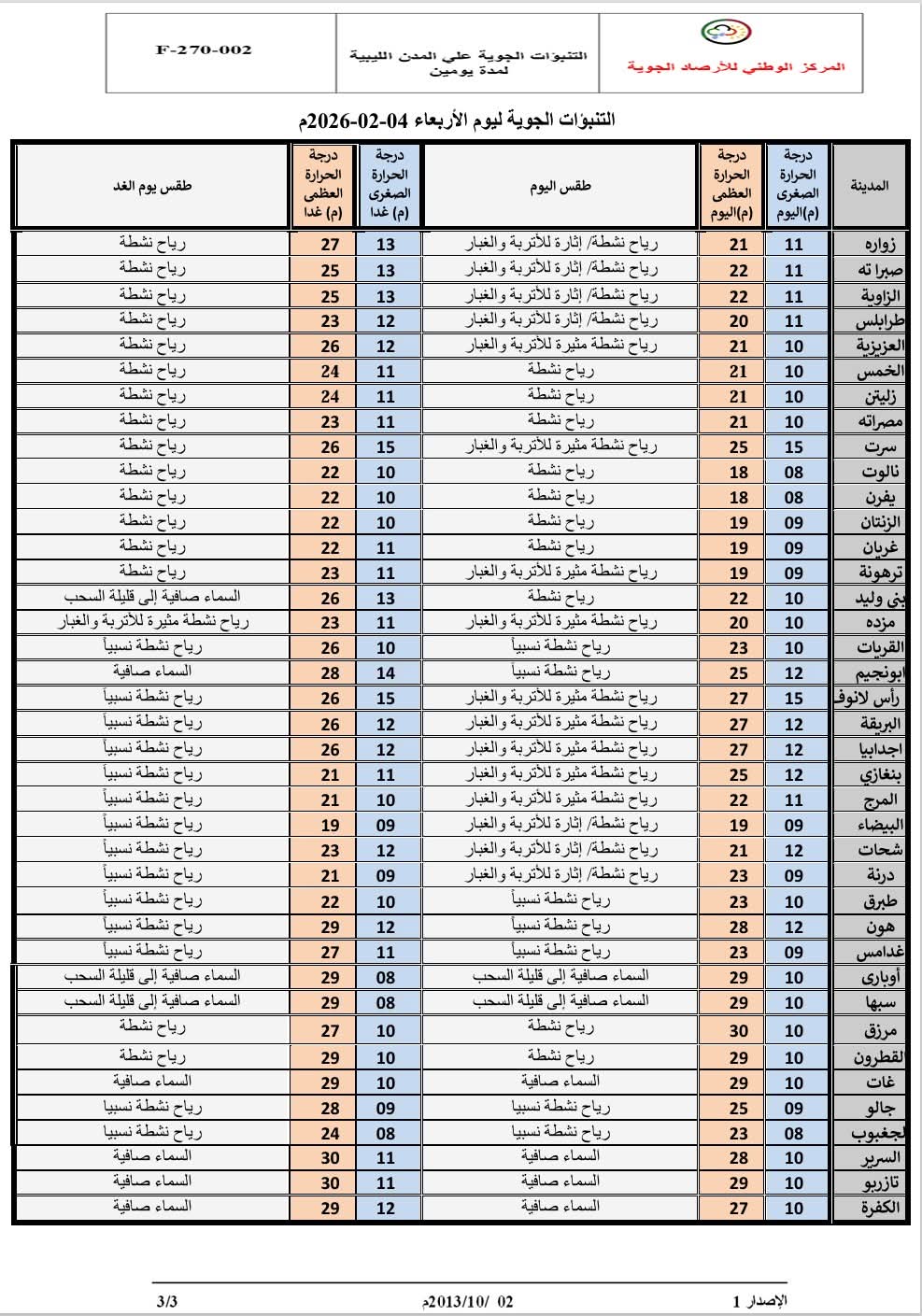 حالة السماء: صافية إلى قليلة السحب تتكاثر مساءً مع احتمال سقوط أمطار خفيفة.