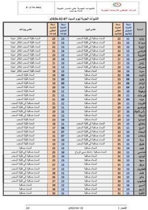 وفي نظرة مستقبلية عامة، توقع المركز أن تسجل درجات الحرارة انخفاضًا واضحًا بدايةً من يوم الاثنين على أغلب مناطق البلاد، مع رياح غربية إلى شمالية غربية نشطة نسبيًا، خاصة على مناطق الشمال والوسط.