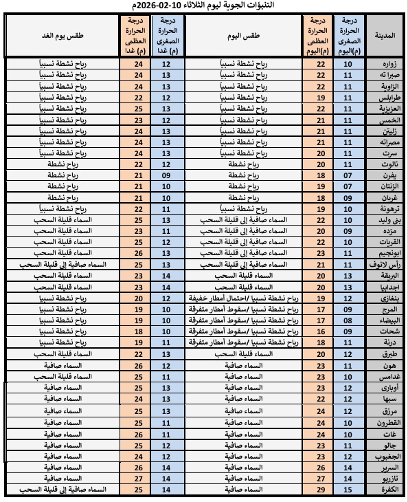 حالة السماء: قليلة السحب تتكاثر على مناطق الجبل الأخضر مع احتمال لسقوط أمطار خفيفة هذا اليوم، وتكون الفرصة أفضل مساء يوم الخميس ويوم الجمعة خاصة على المنطقة الممتدة من شرق بنغازي حتى درنة تصحبها خلايا رعدية.