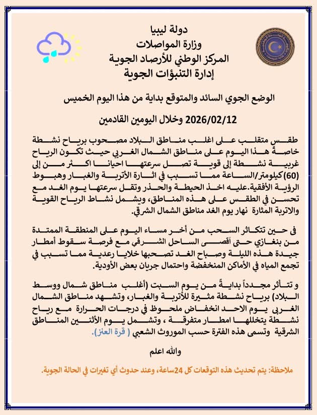 توقّع مركز الأرصاد الجوية أن تشهد ليبيا طقسًا متقلبًا على أغلب مناطق البلاد خلال الأيام الثلاثة القادمة، ابتداءً من اليوم الخميس 12-02-2026، مصحوبًا برياح نشطة خاصة على مناطق الشمال الغربي تكون مثيرة للأتربة والغبار، مع فرصة لسقوط أمطار جيدة هذه الليلة على بعض مناطق الشمال الشرقي.