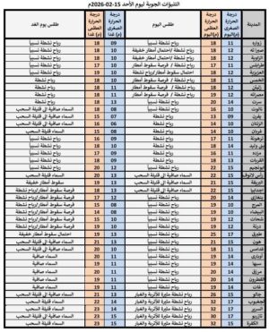 اكد مركز الأرصاد الجوية، أن توقعات الطقس تشير إلى أجواء باردة على أغلب مناطق البلاد اليوم الأحد 15 فبراير 2026، مع نشاط ملحوظ للرياح وتكاثر للسحب على مناطق الشمال، وفرصة لسقوط أمطار متفرقة على بعض المناطق الساحلية، خاصة يوم الغد على مناطق الشمال الشرقي.