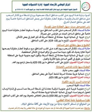 وأضاف المركز في نشرته الجوية اليوم الأحد، في مناطق رأس إجدير حتى سرت وسهل الجفارة وجبل نفوسة، تتكاثر السحب مع احتمال هطول أمطار متفرقة خاصة على الساحل الممتد من طرابلس إلى مصراتة، بينما تكون الرياح غربية إلى شمالية غربية معتدلة إلى نشطة السرعة وقد تثير الغبار أحيانًا، وتتراوح درجات الحرارة القصوى بين 13 و19 درجة مئوية.