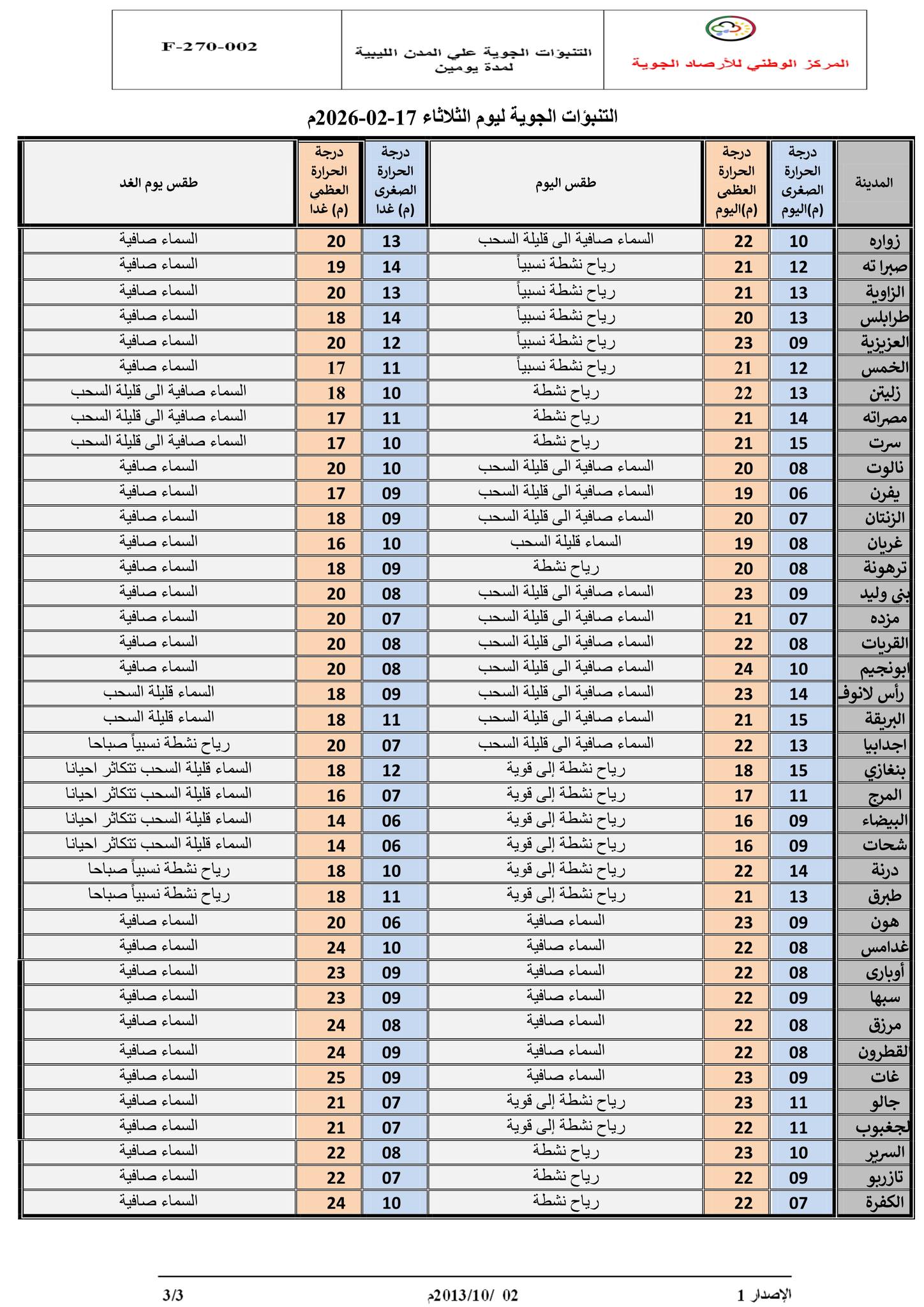 حالة السماء: فرصة سقوط أمطار متفرقة على أغلب المناطق قد تكون جيدة على الجبل الأخضر يصحبها أحياناً خلايا رعدية، مما يتسبب في تجمع المياه بالأماكن المنخفضة، وتنقشع السحب الممطرة من مساء يوم الغد.
