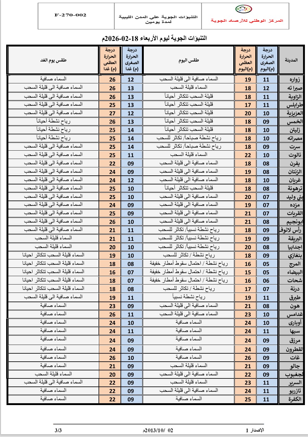 حالة السماء: صافية إلى قليلة السحب على غدامس والحمادة ومناطق الجفرة.