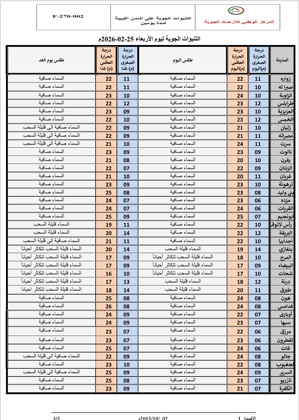 حالة السماء: صافية إلى قليلة السحب مع ظهور ضباب آخر هذه الليلة وفي الصباح الباكر ليوم الغد على الساحل من مصراتة إلى سرت.