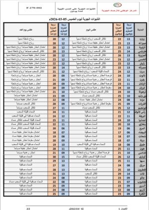 ولفت المركز إلى أن الأجواء ستبقى دون تغير كبير على معظم مناطق البلاد خلال الأيام المقبلة، مع نشاط نسبي للرياح على مناطق الشمال الغربي.