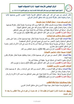 توقع مركز الأرصاد الجوية تكاثر السحب من حين إلى آخر على بعض المناطق الغربية خاصة الجنوب الغربي، مع نشاط خلايا رعدية وسقوط أمطار متفرقة، على أن تمتد هذه الحالة الجوية يوم الغد لتشمل مناطق الشمال الشرقي.