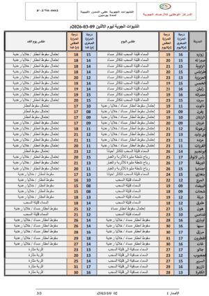 أما مناطق (الواحات – السرير – تازربو – الكفرة) فستكون السماء فيها صافية إلى قليلة السحب، مع تكاثر السحب يوم الغد على الواحات وجالو قد يصحبها خلايا رعدية وسقوط زخات من المطر، مع رياح جنوبية شرقية معتدلة السرعة تنشط أحياناً على بعض المناطق مسببة إثارة الأتربة والرمال، ودرجات حرارة قصوى تتراوح بين 23 و29 درجة مئوية.