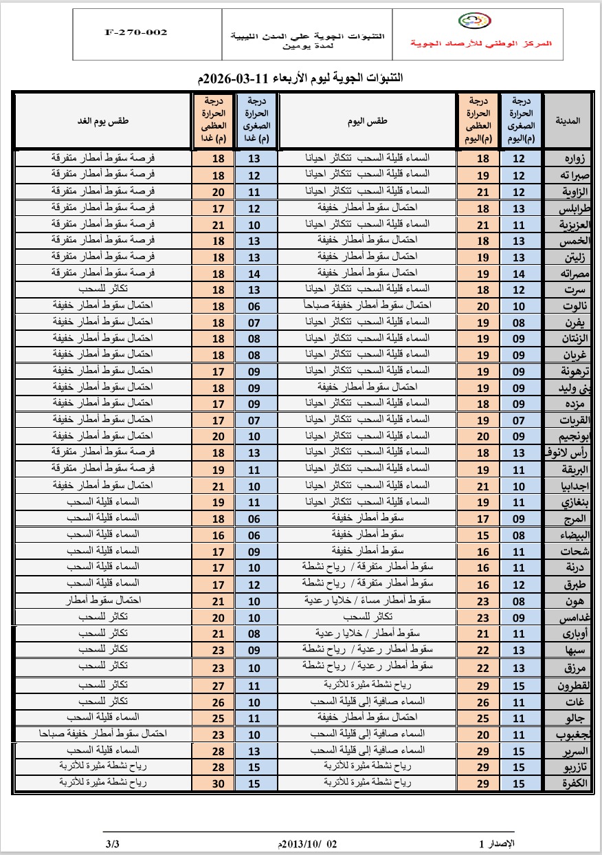 حالة السماء: سقوط أمطار جيدة تصحبها خلايا رعدية وتكون جيدة هذا اليوم إلى غزيرة أحيانا على شمال سبها وأوباري ومناطق الحمادة والجفرة والفقها والهروج، مما يتسبب في تجمع المياه بالأماكن المنخفضة واحتمال جريان بعض الأودية.